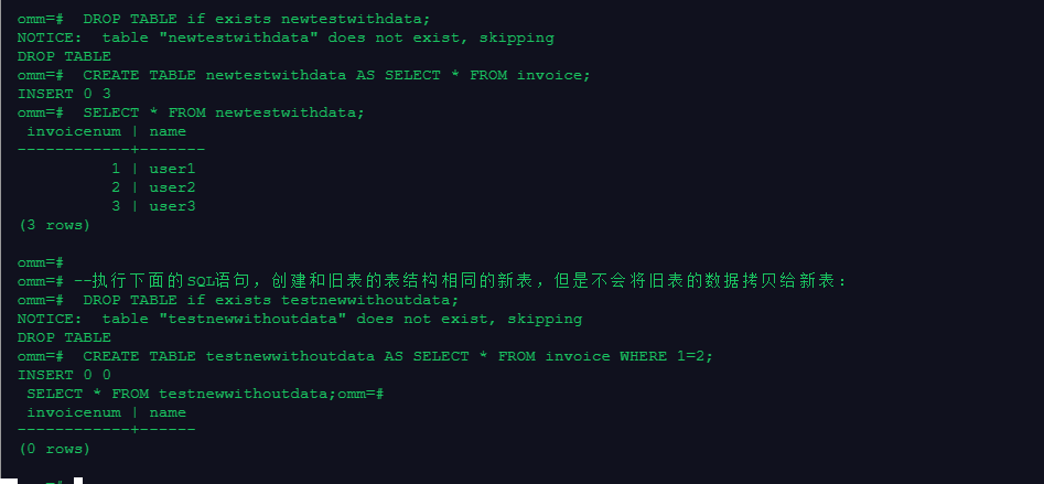 --执行下面的SQL语句,将创建新表,并且会将旧表的数据拷贝给新表: DROP TABLE if exists newtestwithdata; CREATE TABLE newtestwithdata AS SELECT * FROM invoice; SELECT * FROM newtestwithdata; --执行下面的SQL语句,创建和旧表的表结构相同的新表,但是不会将旧表的数据拷贝给新表: DROP TABLE if exists testnewwithoutdata; CREATE TABLE testnewwithoutdata AS SELECT * FROM invoice WHERE 1=2; SELECT * FROM testnewwithoutdata;
