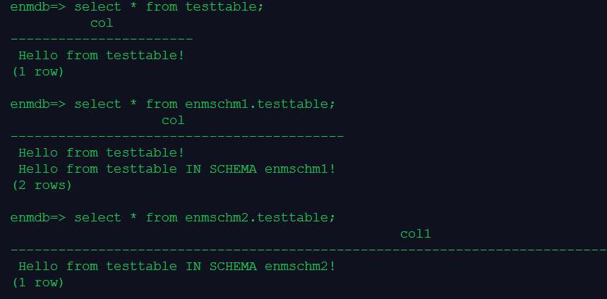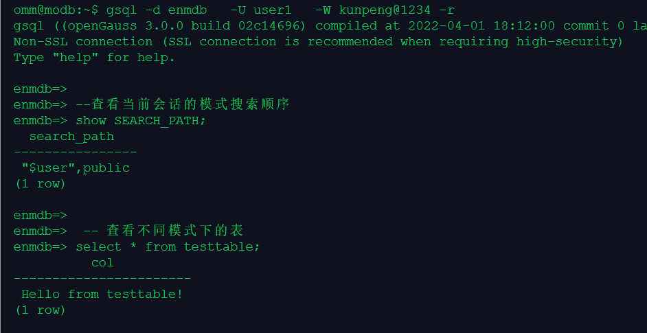 3.在会话级设置模式搜索路径为:模式enmschm1,使用SchemaName.TableName的表标识方法访问表(创建表、插入数据和查询表中数据):