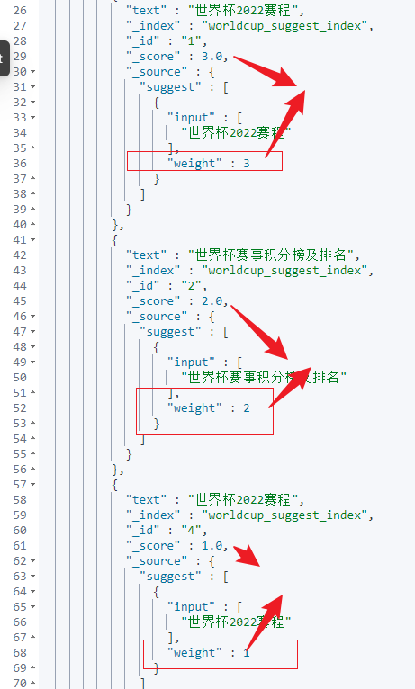 然后,写入数据。同时指定input 文本和 weight 权重。input 代表补全建议的文本信息;weight 代表权重,权值越大,计算的评分越高;反之,则相反。