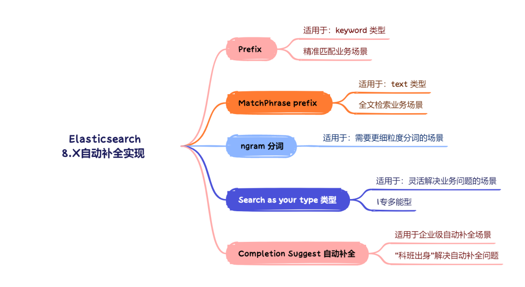 关于Elasticsearch 8.X 能实现自动补全,本文提供了五种不同的方案。几种方案的对比概括如下: