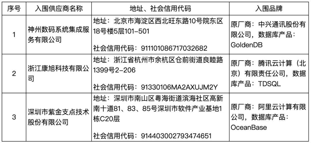 2022年12月8日发布中标结果,中兴通讯GoldenDB、腾讯云TDSQL、阿里云OceanBase三家均中标。