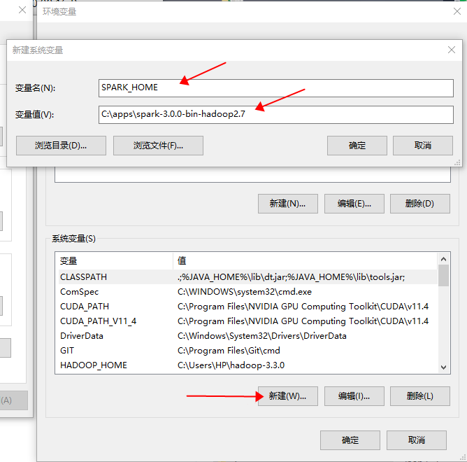 2.在以下环境变量屏幕上,通过选择新建选项添加 SPARK_HOME