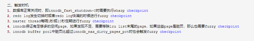 「Checkpoint 发生的时间、条件及脏页的选择等都非常复杂。而 Checkpoint 所做的事情无外乎是将缓冲池中的脏页刷回到磁盘,不同之处在于每次刷新多少页到磁盘,每次从哪里取脏页,以及什么时间触发 Checkpoint。这些本文不会去研究」。