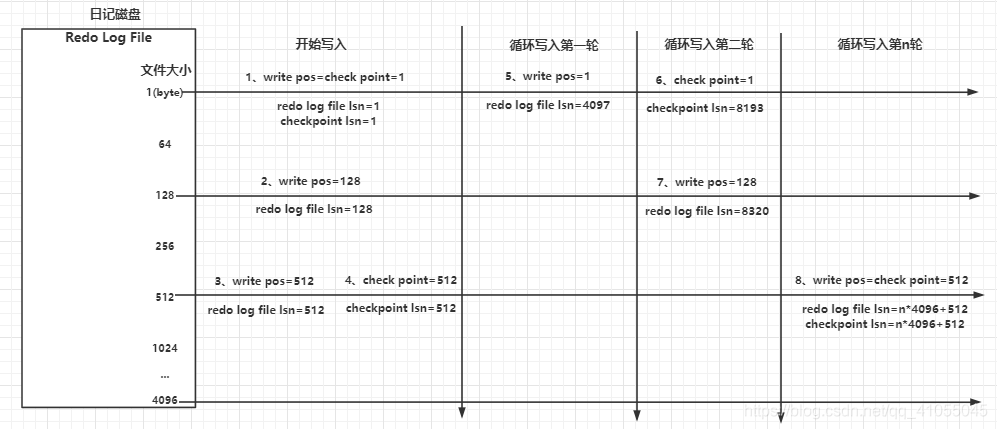 1-8 按时间顺序发生。1 点是假设最初的状态;2、3 点写日记磁盘;4 点是触发了检查点 checkpoint,进行刷盘,「checkpoint lsn=1开始」,刷盘结束并更新「checkpoint lsn=512」。在 5 点、6 点已经刷过了一循环内存、二循环内存,「从头开始写入 log,两个指针指向回到了头部」。第 7 点也是一个触发 checkpoint 的过程。9 点是假设没有更新,最后达到平衡的结果,即内存中数据页和日记都完成了刷盘。