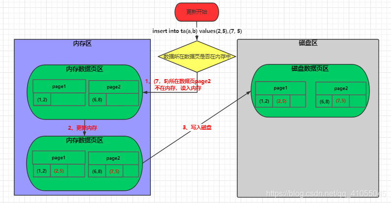 数据 (2,5) 所在页 page 1 在内存中直接更新内存;数据 (7,5) 所在页 page 2 不在内存中,记录 change buffer(具有唯一性的索引或者没有使用 change buffer 的操作是将磁盘中的数据页读入内存中并做更新)。