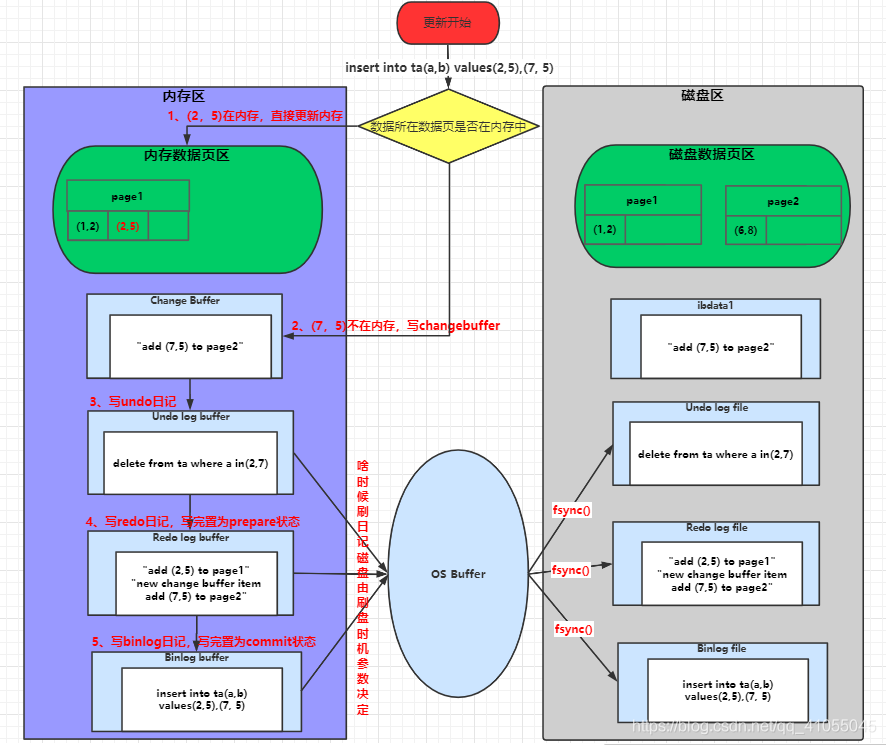 过程是 两阶段提交-----日记刷盘------数据刷盘(涉及 Redo log lsn 和 ChangeBuffer 的内容)