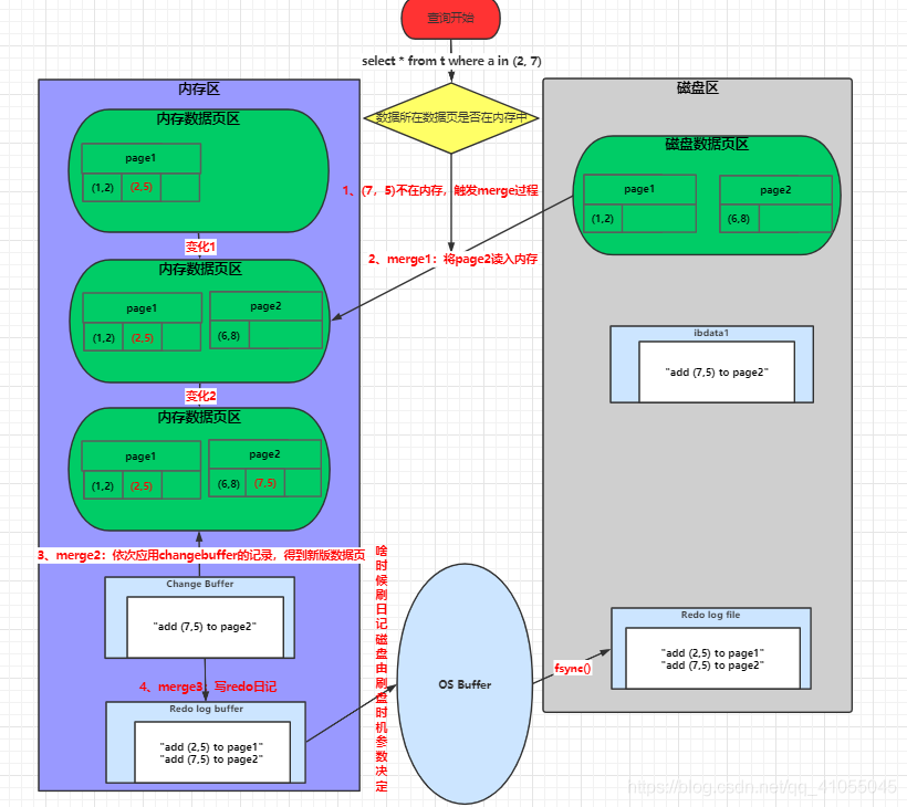 紧接着上文,图片可上下参考,假设现在执行查询语句 select * from t where a in (2, 7) ,此次查询索引 a=7 所在的数据页不在内存中,并且上一步更新已经在 change buffer 中有记录,将会触发 merge 过程