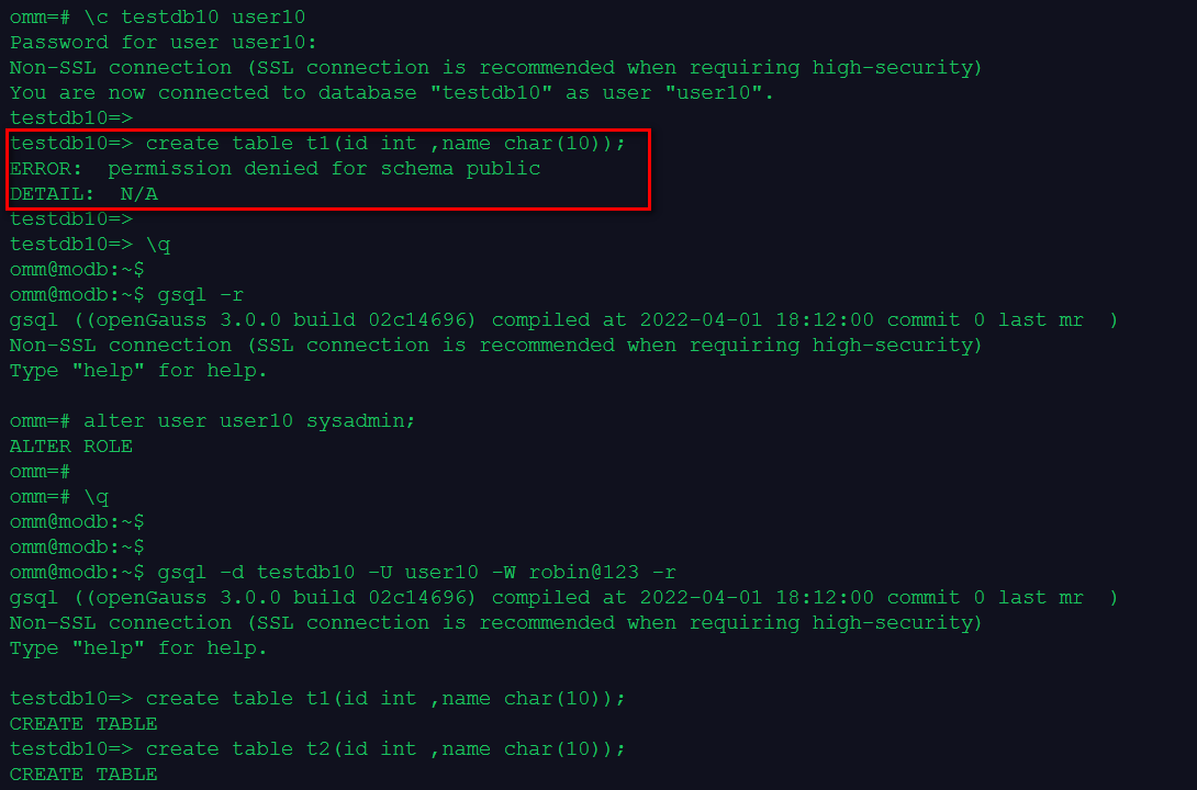 alter user user10 sysadmin; ##若不授权,会提示无权限创建表