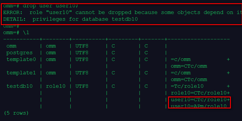 若用户下存在数据库、表空间/表等对象、未清理的权限时,无法删除用户。
