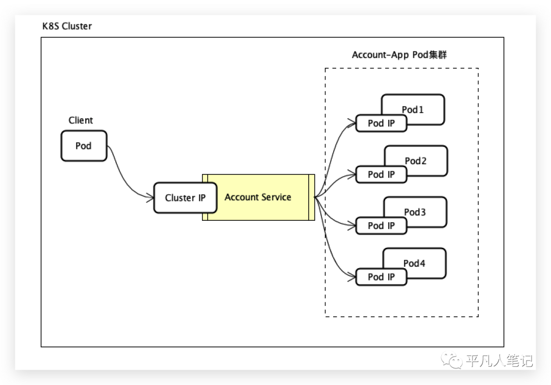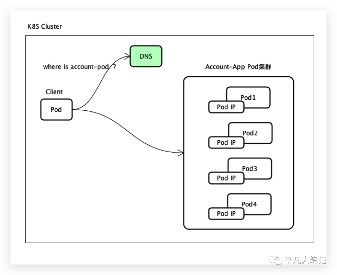 一个是服务发现,client pod如何发现并且定位account app集群中的pod ip,况且account app集群中的ip有可能会变(逾期的情况,比如重新发布;非逾期的情况, 比如pod挂了,k8s重新调度部署,pod ip也会变化)。