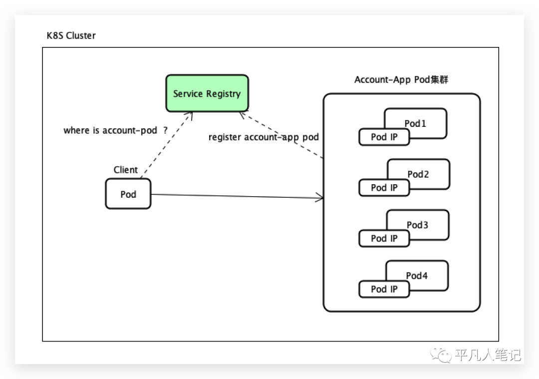 k8s把account-app pod集群的信息(ip和端口)自动注册到service registry,client 应用通过service registry可以查询和发现这些目标pod,然后就可以发起调用。