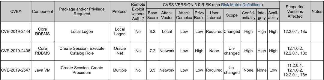 此次Critical Patch Update(CPU)共修复了284个Oracle系产品的安全漏洞,包括数据库、中间件、虚拟机、Java等。其中Oracle数据库相关的有3个,对应的CVE如下: