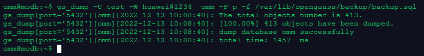 7,openGauss数据库dump格式备份与恢复,此种格式与上面的备份与恢复操作过程类似,不在重复截图了。