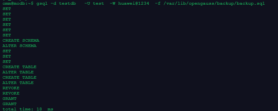 5,使用用户test,执行用gs_dump生成的sql脚本,将数据恢复到testdb数据库中.