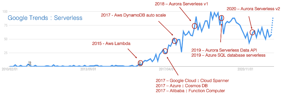 从Google Trends的Serverless关键字的趋势可以看到,对于Serverless的搜索一直居高不下,并且在未来的一段时间内也会保持相当的热度。从2015年开始,以AWS为代表的国外云计算大厂也在不断的布局Serverless相关的产品,AWS Lambda、Aliyun FAAS,数据库领域的Aurora Serverless、RedShift Serverless、Azure SQL Database等。