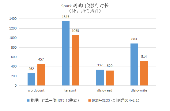 在此场景下,测试人员对比了存算一体的传统物理大数据方案与 BCDP+XEOS 对象存储的存算分离部署模式在运行 Spark 批测试用例时的性能。后者同时结合 XEOS 的 EC 纠删码机制,可以降低大数据的长期存储成本。