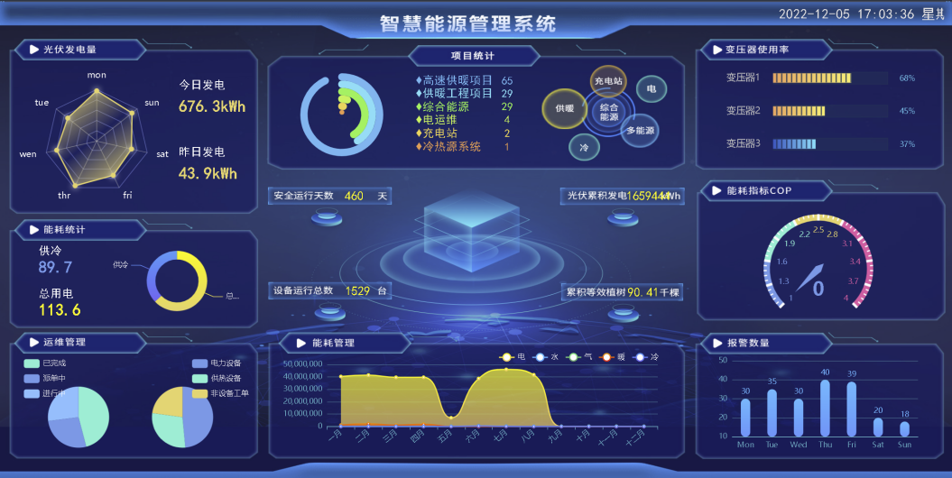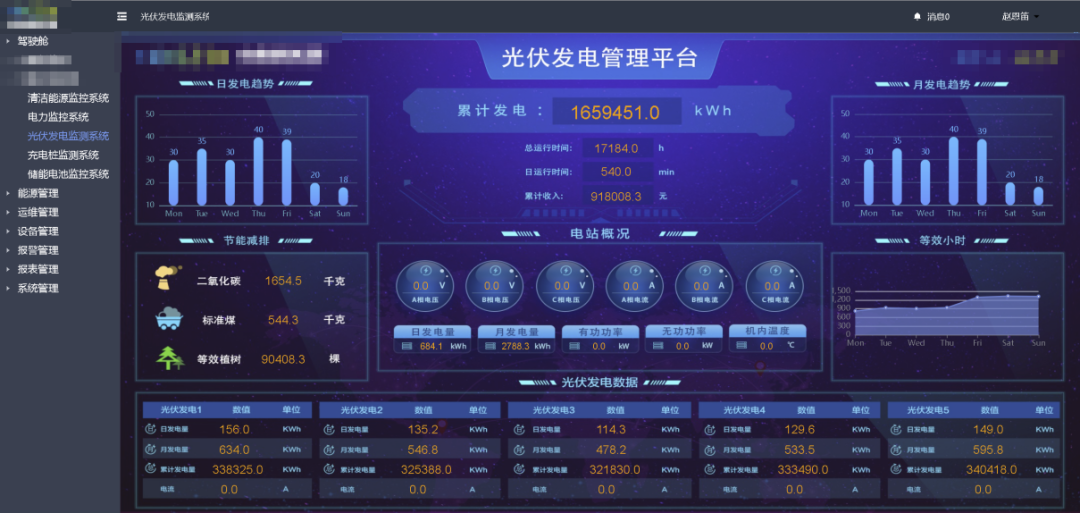 提供园区整体的关键信息,包含全园区的光伏发电量、能耗统计、运维管理、报警数据,和公司在全省所有的能源管理项目综合信息。