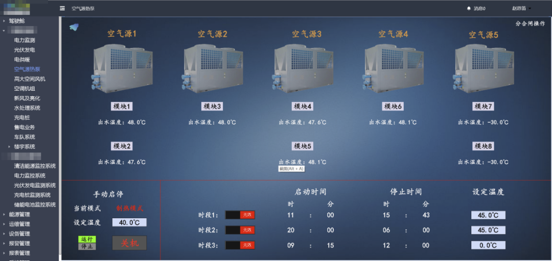 展示园区内所有空气热源泵的运行状态与关键运行数据,用户可在此界面上远程操控热源泵的启停。
