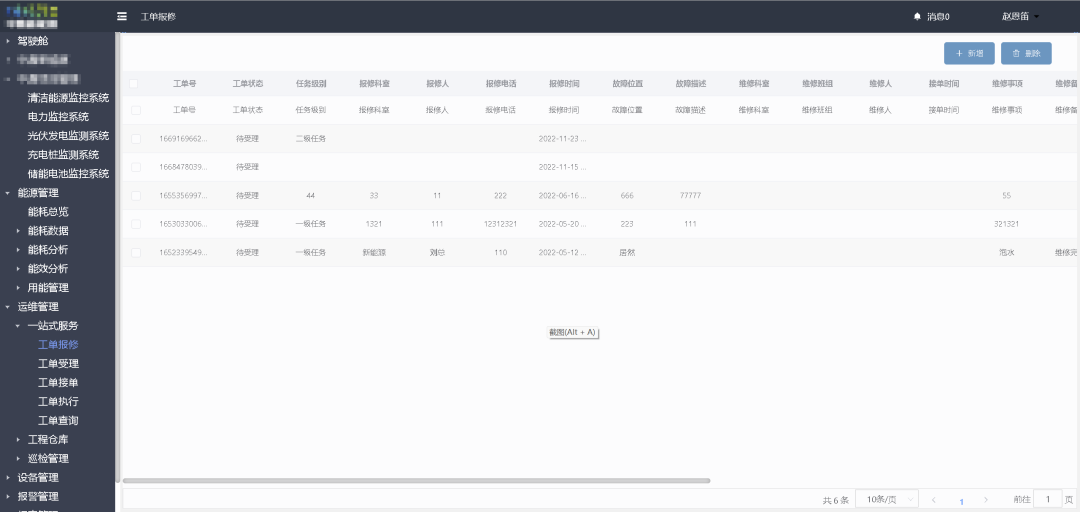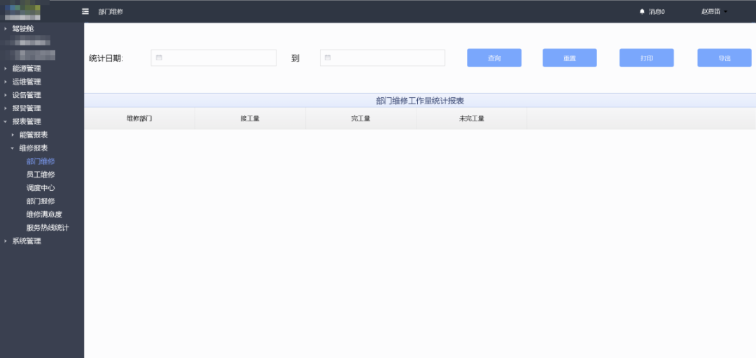 报表管理分为能管报表与维修报表。能管报表包括:总能耗报表、供热能耗报表等;维修报表包含:部门维修、员工维修、服务热线统计等。