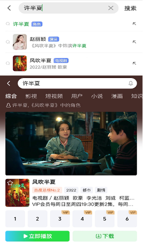 基于爱奇艺行业领先的知识图谱与语义理解能力,用户搜索剧中角色或剧情卡段,会自动跳转剧集内容,这满足了用户多样化的搜索需求。比如在爱奇艺搜索“许半夏”,将直接关联角色扮演者赵丽颖和《风吹半夏》,搜索“赵丽颖新剧”也能一键跳转播放,进一步便捷查找和观看路径。