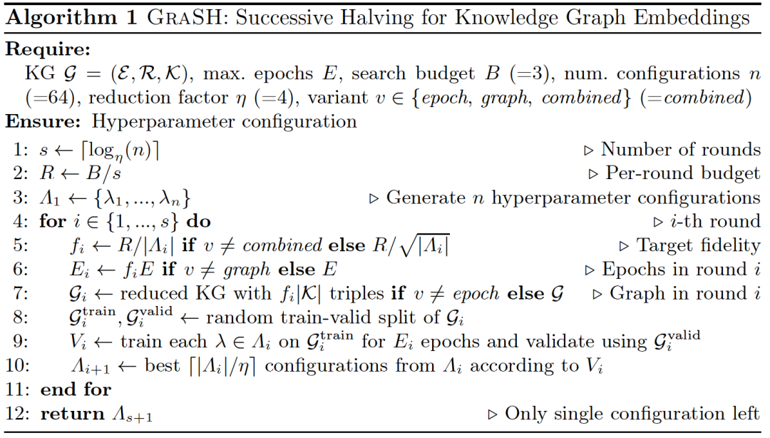 本文致力于在给定的搜索代价约束下,尽可能高效地获得高质量的KGE模型。基于连续减半的思想,提出了一个GRASH算法,通过将减少训练轮次和减小图规模的技术结合,在多质量层级下,实现KGE超参数优化的高质量和低消耗。算法的核心思想见下图: