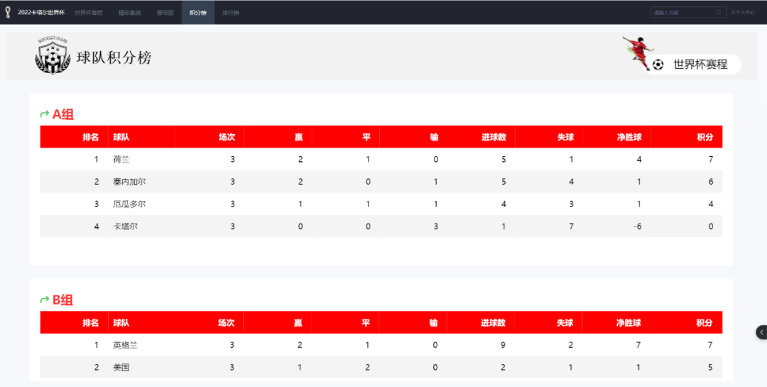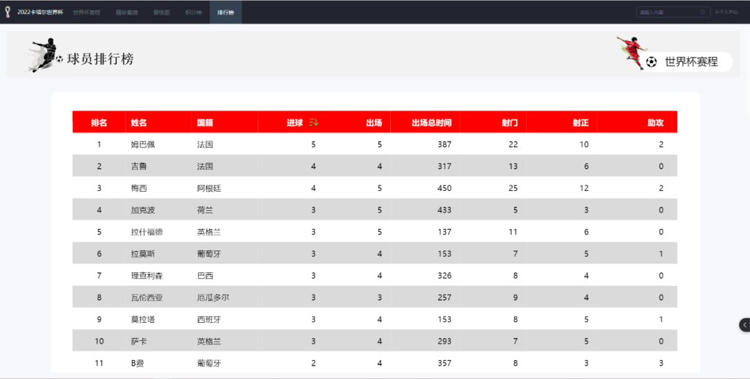 界面还综合了本届比赛的所有比赛数据,支持球队和个人积分榜、排行榜分析。
