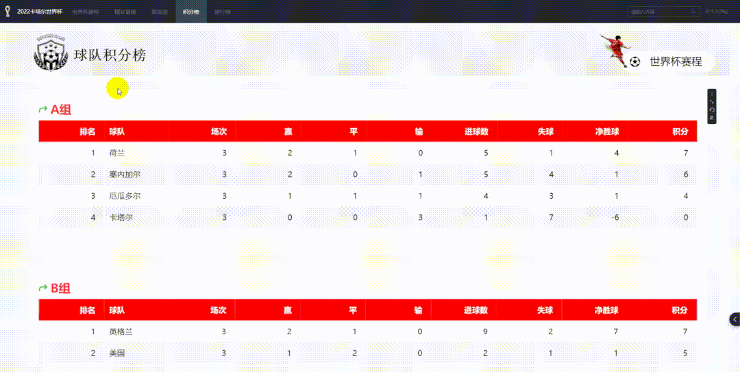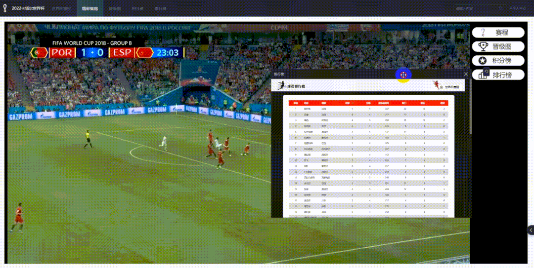 在用GVP制作世界杯观赛系列页面时,所有界面均为0代码完成,完全在GVP现有功能组件中进行拖拽式操作。目前,该系列界面可支持赛程进度、晋级情况、比分实况查看等。如图所示,呈现的界面排布工整,所有信息一目了然,这完全依赖于GVP画布构建功能,让操作者可以像制作PPT时依据个人意愿灵活配置。