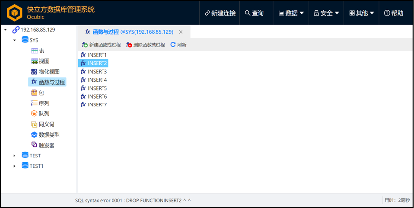在函数与过程信息界面,通过“新建函数或过程”功能来跳转新建界面,输入SQL语句,点击“保存”即可完成创建;点击相应的函数名称可查看函数语句。