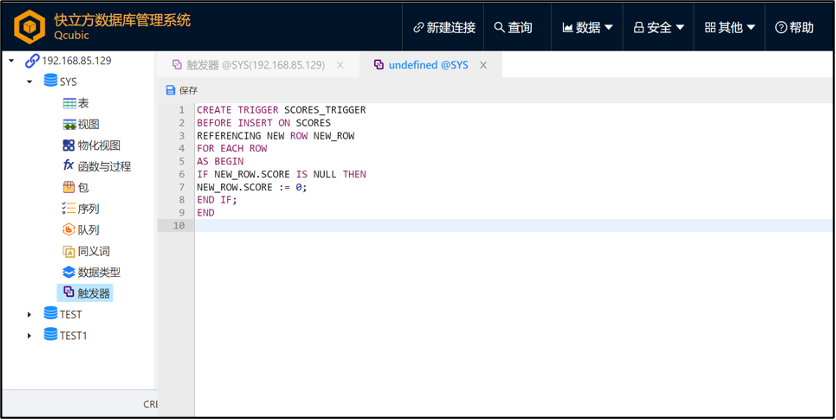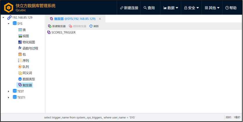 在触发器信息界面,通过“新建触发器”功能来跳转新建界面,输入SQL语句,点击“保存”即可完成创建;点击相应的触发器名称可查看触发器语句。