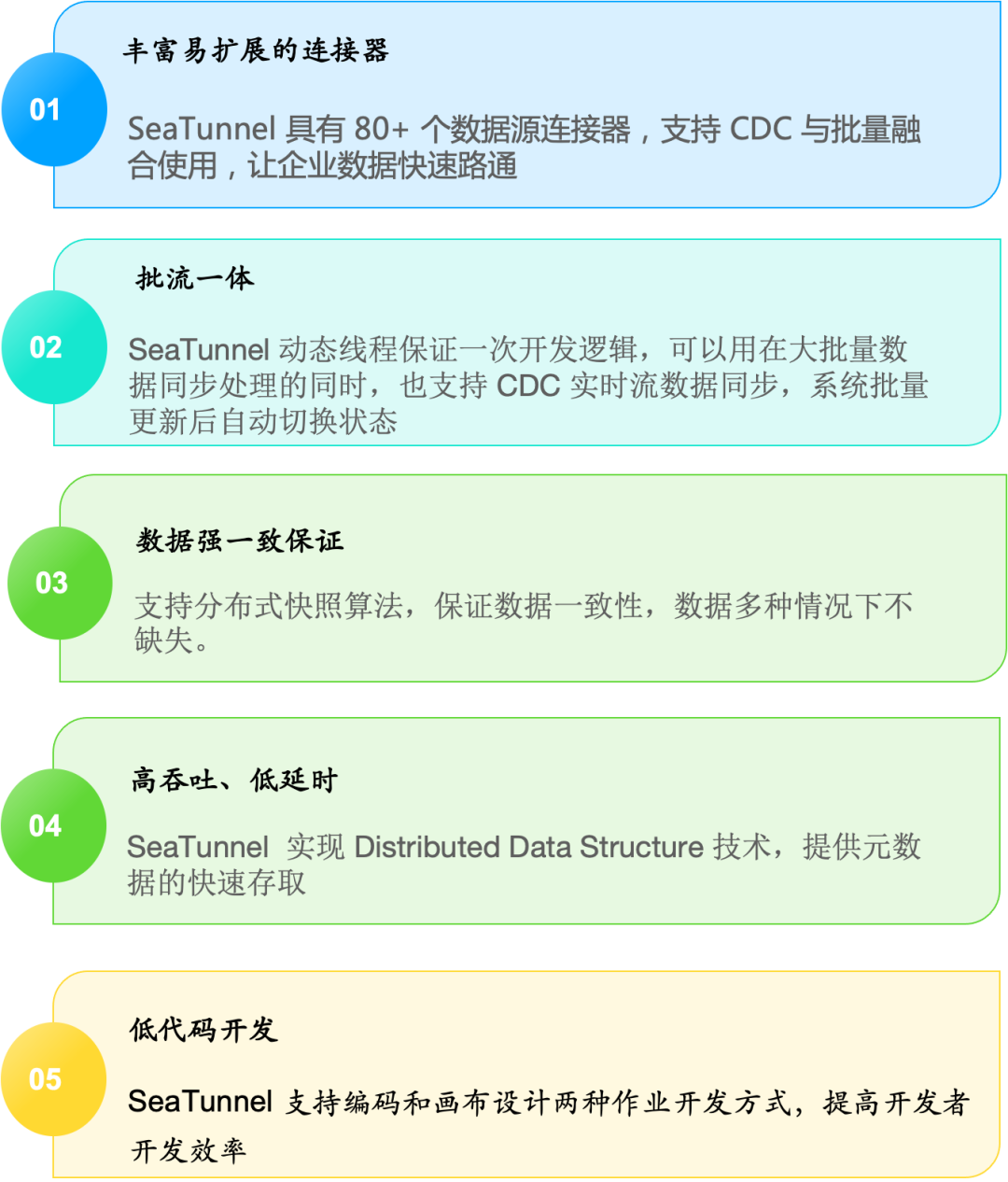 丰富易扩展的 Connector:SeaTunnel提供了不依赖具体执行引擎的 Connector API,SeaTunnel 提供了一套不依赖于具体执行引擎的 SeaTunnel Connector API,基于这套API开发的 Connector(Source, Transform, Sink) 可以运行在多种不同的引擎上,目前支持 SeaTunnel Engine, Flink, Spark。 Connector 插件化:插件化的设计让用户可以方便的开发自己的 Connector 并轻松集成到 SeaTunnel 项目中,目前 SeaTunnel 已经支持的 Connector 有 80 多个,这个数量正在以极快的速度增长。目前已经支持的连接器列表见下图。 批流一体:基于 SeaTunnel Connector API 开发的连接器可以完美兼容离线同步、实时同步、全量同步、增量同步等多种场景。这在极大程度上降低了数据集成任务管理的困难。 支持分布式快照算法,保证数据一致性。 多引擎支持:SeaTunnel 默认使用 SeaTunnel Engine 进行数据同步。同时为了适配企业已有的技术组件,SeaTunnel 还同时支持使用 Flink 或者 Spark 做为 Connector 的运行时执行引擎,SeaTunnel 支持多个 Spark 和 Flink 版本。 JDBC 多路复用,数据库日志多表解析:SeaTunnel 支持多表或整库同步,解决 JDBC 连接数过多的问题;支持多表或整库数据库日志读取解析,解决 CDC 多表同步场景下需要重复读取和解析日志的问题。 高吞吐、低延时:SeaTunnel 支持并行读取和写入,提供了高吞吐低延时稳定可靠的数据同步能力。 完善的实时监控:SeaTunnel 正在支持数据同步过程中每一步的详细监控信息,让用户轻松了解同步任务读取和写入的数据条数、数据大小、QPS 等信息。 支持编码和画布设计两种作业开发方式:SeaTunnel web 项目中提供了作业可视化管理、调度、运行和监控能力。