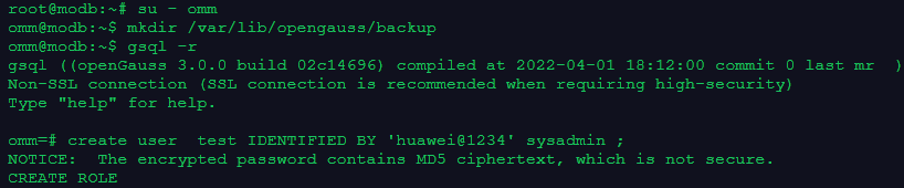 先创建备份文件夹和备份恢复用户(sysadmin权限)