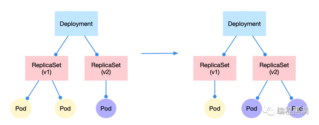 在更新的过程,是逐渐将旧的ReplicaSet所管理的Pod删除,新的ReplicaSet管理的Pod新增这么一个过程。