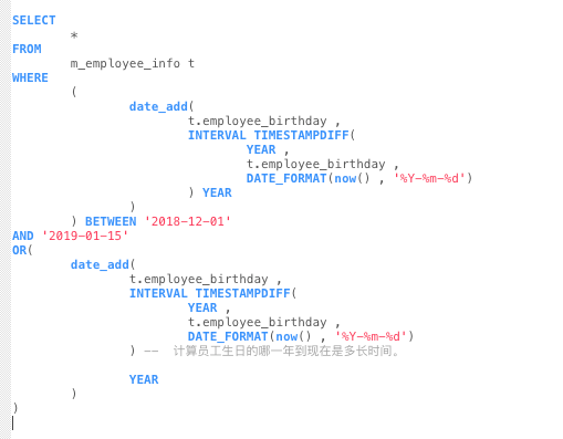方法二:取出员工的生日,比较与现在输入查询的年份【用户输入的不一定是今年哦~所以,不能取现在的时间】的[差距多少年],也就是算了算他多少岁,然后把他生日的年份加上+[[差距多少年]],就是所选查询日期的起始年份。