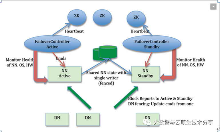 DataNode 节点——除了通过共享存储系统共享 HDFS 的元数据信息之外,主 NameNode 和备 NameNode 还需要共享 HDFS 的数据块和 DataNode 之间的映射关系。DataNode 会同时向主 NameNode 和备 NameNode 上报数据块的位置信息。