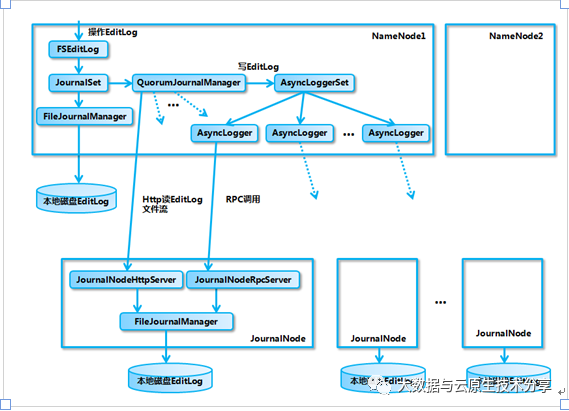 :封装了对 JournalNode 集群上的 EditLog 的操作,它会根据 JournalNode 集群的 URI 创建负责与 JournalNode 集群通信的类 AsyncLoggerSet, QuorumJournalManager 通过 AsyncLoggerSet 来实现对 JournalNode 集群上的 EditLog 的写操作,对于读操作,QuorumJournalManager 则是通过 Http 接口从 JournalNode 上的 JournalNodeHttpServer 读取 EditLog 的数据。AsyncLoggerSet
