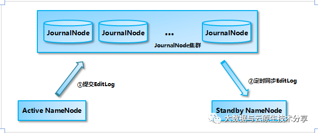 Active NameNode 和 StandbyNameNode 使用 JouranlNode 集群来进行数据同步的过程如下图 所示,Active NameNode 首先把 EditLog 提交到 JournalNode 集群,然后 Standby NameNode 再从 JournalNode 集群定时同步 EditLog:
