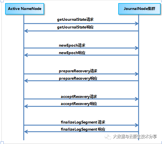 处 于 Standby 状态的 NameNode 转换为 Active 状态的时候,有可能上一个 Active NameNode 发生了异常退出,那么 JournalNode 集群中各个 JournalNode 上的 EditLog 就可能会处于不一致的状态,所以首先要做的事情就是让 JournalNode 集群中各个节点上的 EditLog 恢复为一致。另外如前所述,当前处于 Standby 状态的 NameNode 的内存中的文件系统镜像有很大的可能是落后于旧的 Active NameNode 的,所以在 JournalNode 集群中各个节点上的 EditLog 达成一致之后,接下来要做的事情就是从 JournalNode 集群上补齐落后的 EditLog。只有在这两步完成之后,当前新的 Active NameNode 才能安全地对外提供服务。