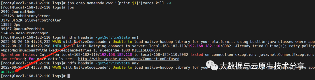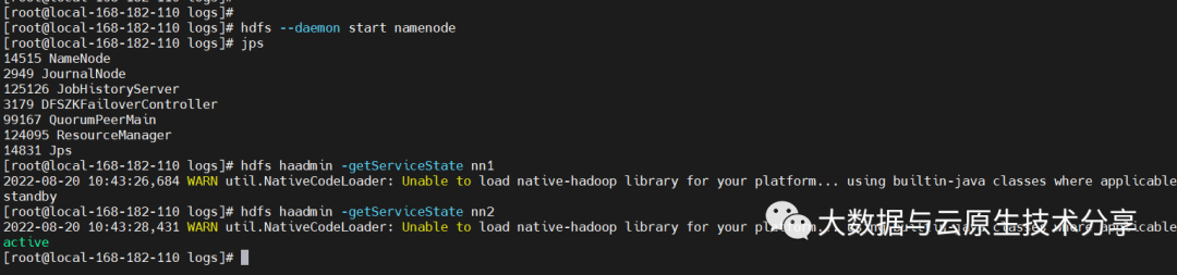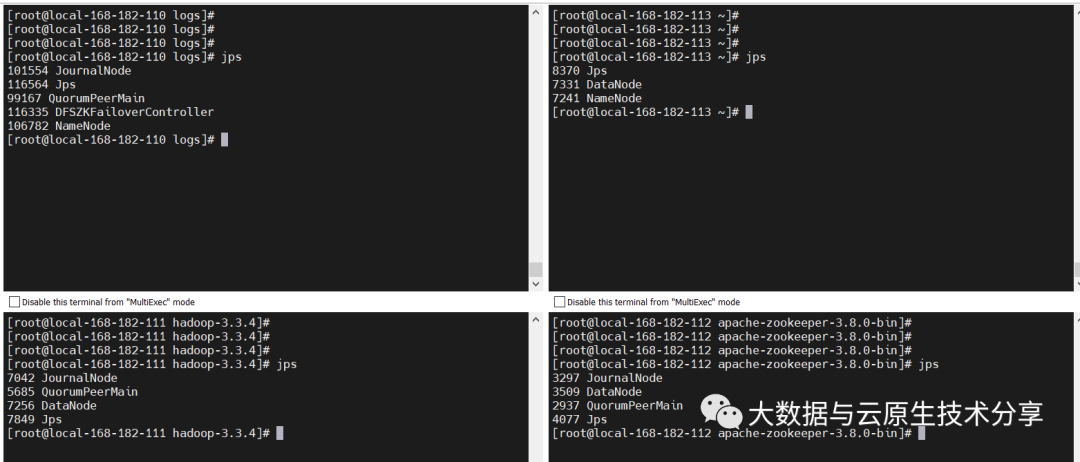 进行初始化,创建 Zookeeper 上的/hadoop-ha/${dfs.nameservices} 节点。创建节点是为随后通过 Zookeeper 进行主备选举做好准备,在进行主备选举的时候会在这个节点下面创建子节点。这一步通过在原有的 NameNode 上执行命令 hdfs zkfc -formatZK 来完成。启动所有的
