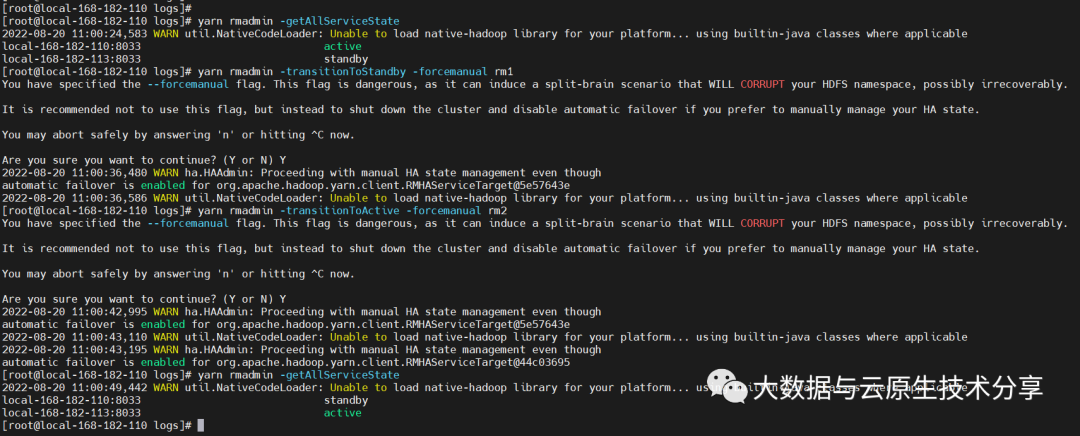 yarn rmadmin -transitionToActive -forcemanual rm1