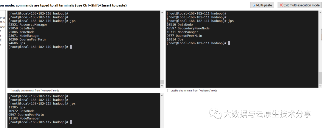 | local-168-182-111 | 192.168.182.111 | DataNode、HRegionServer、SecondaryNameNode、NodeManager、QuorumPeerMain |