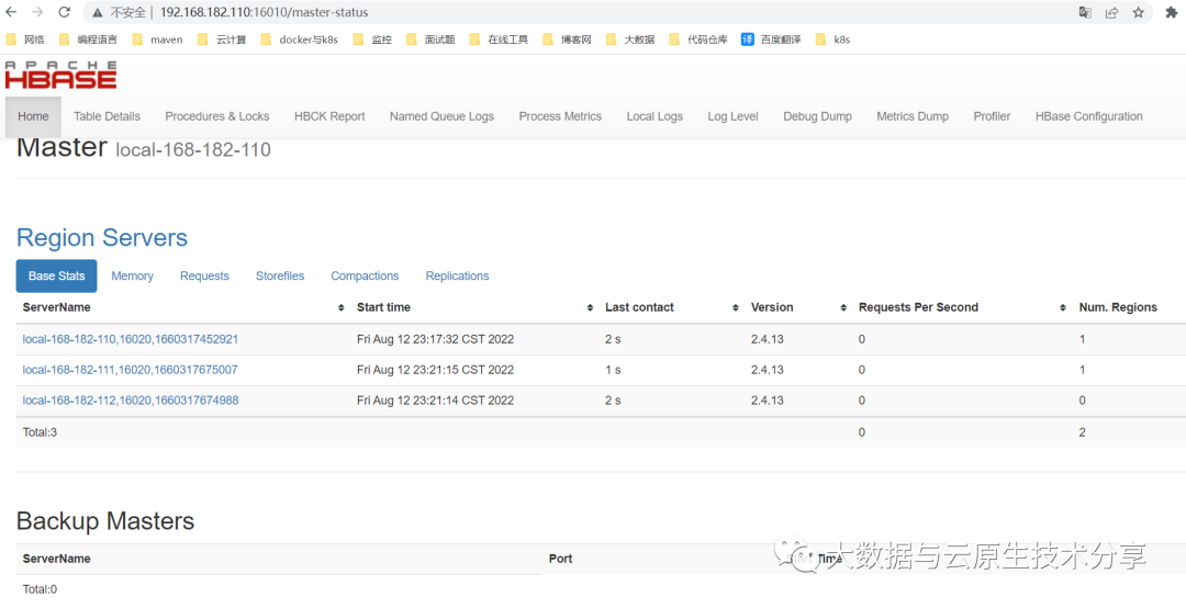 | local-168-182-110 | 192.168.182.110 | NodeManager、QuorumPeerMain、HMaster、DataNode、HRegionServer |