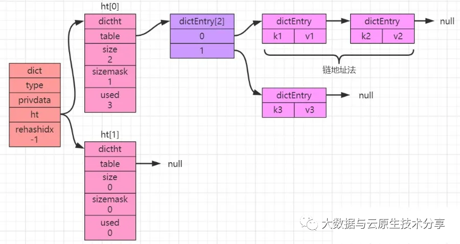 在Redis中,hash哈希被称为字典(dictionary),Redis的字典使用哈希表作为底层实现,一个哈希表里面可以有多个哈希表节点,而每个哈希表节点保存了字典中的一个键值对。