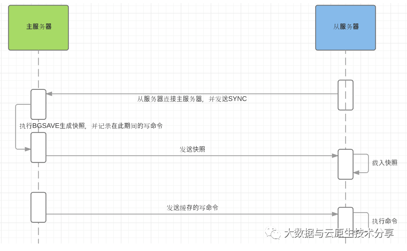 当slave启动后,主动向master发送SYNC命令。master接收到SYNC命令后在后台保存快照(RDB持久化)和缓存保存快照这段时间的命令,然后将保存的快照文件和缓存的命令发送给slave。slave接收到快照文件和命令后加载快照文件和缓存的执行命令。