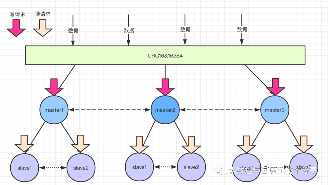 如上图所示,Redis集群可以看成多个主从架构组合起来的,每一个主从架构可以看成一个节点(其中,只有master节点具有处理请求的能力,slave节点主要是用于节点的高可用)