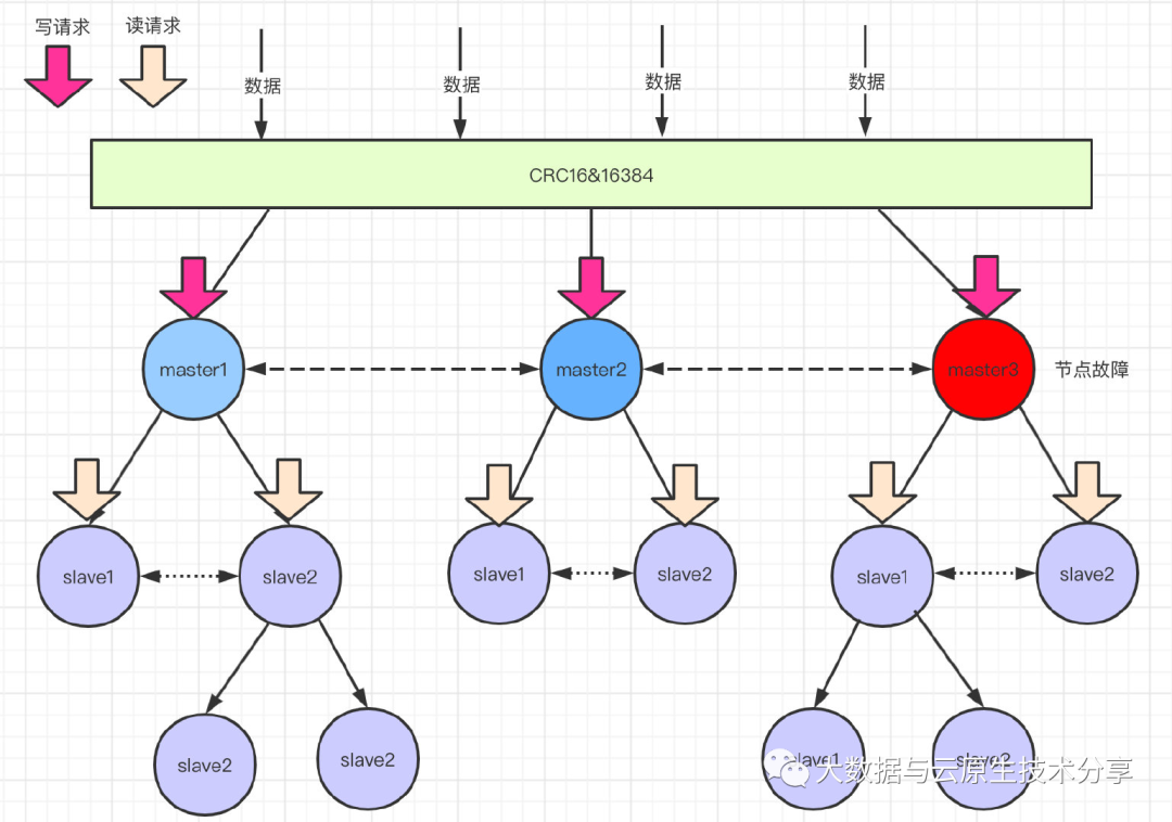 假如下图中红色的节点故障了,此时master3下面的从节点会通过 选举 产生一个主节点。替换原来的故障节点。