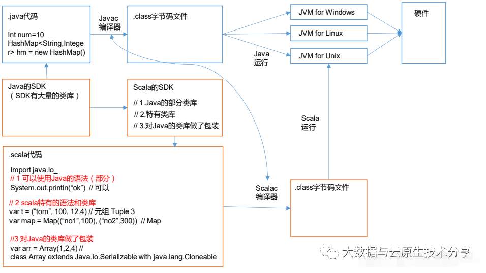 Scala源代码(.scala)会被编译成Java字节码(.class),然后运行于JVM之上,并可以调用现有的Java类库,实现两种语言的无缝对接。