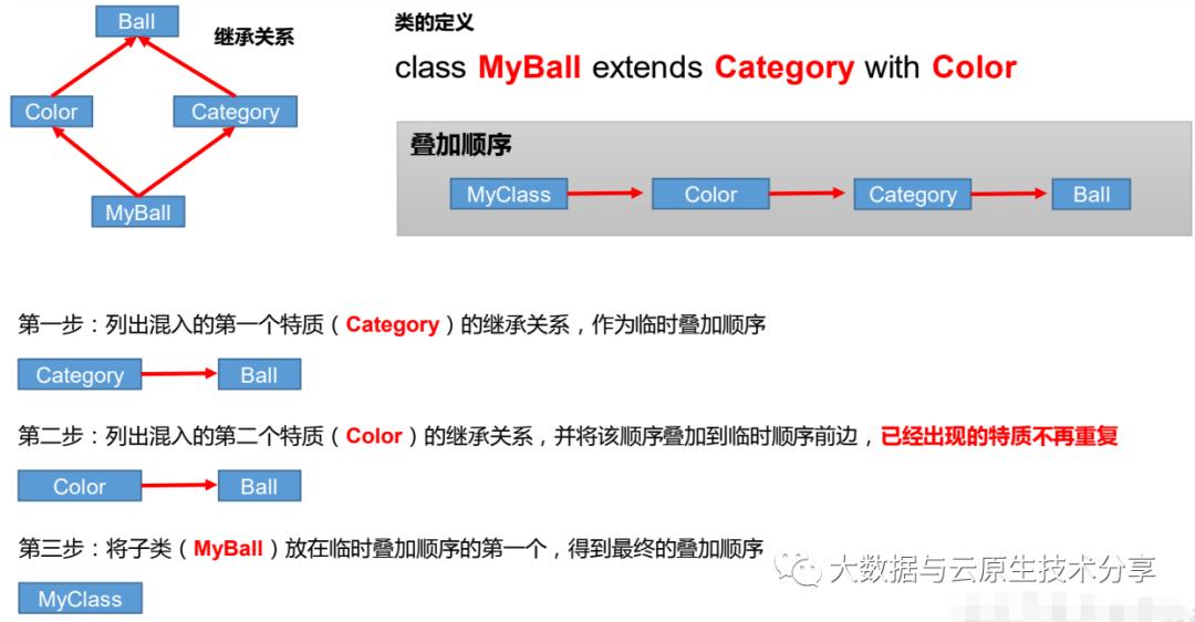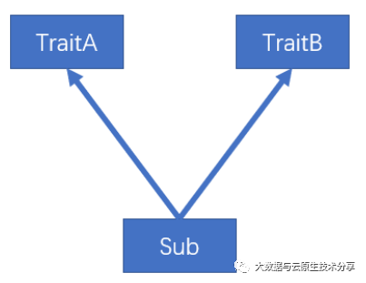 相当于 Java 的接口,与接口不同的是它还可以定义属性和方法的实现,这一点又更像 Java 的抽象类。一般情况下 Scala 的类只能够继承单一父类,但是如果是 trait(特征) 的话就可以继承多个,从结果来看就是实现了多重继承。