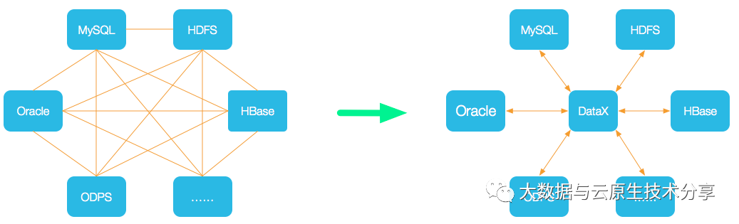 为了解决异构数据源同步问题,DataX将复杂的网状的同步链路变成了星型数据链路,DataX作为中间传输载体负责连接各种数据源。当需要接入一个新的数据源的时候,只需要将此数据源对接到DataX,便能跟已有的数据源做到无缝数据同步。