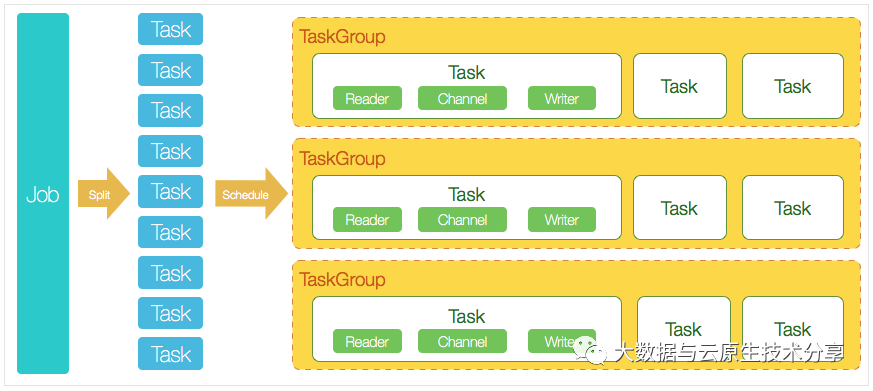 DataX完成单个数据同步的作业,我们称之为Job,DataX接受到一个Job之后,将启动一个进程来完成整个作业同步过程。DataX Job模块是单个作业的中枢管理节点,承担了数据清理、子任务切分(将单一作业计算转化为多个子Task)、TaskGroup管理等功能。