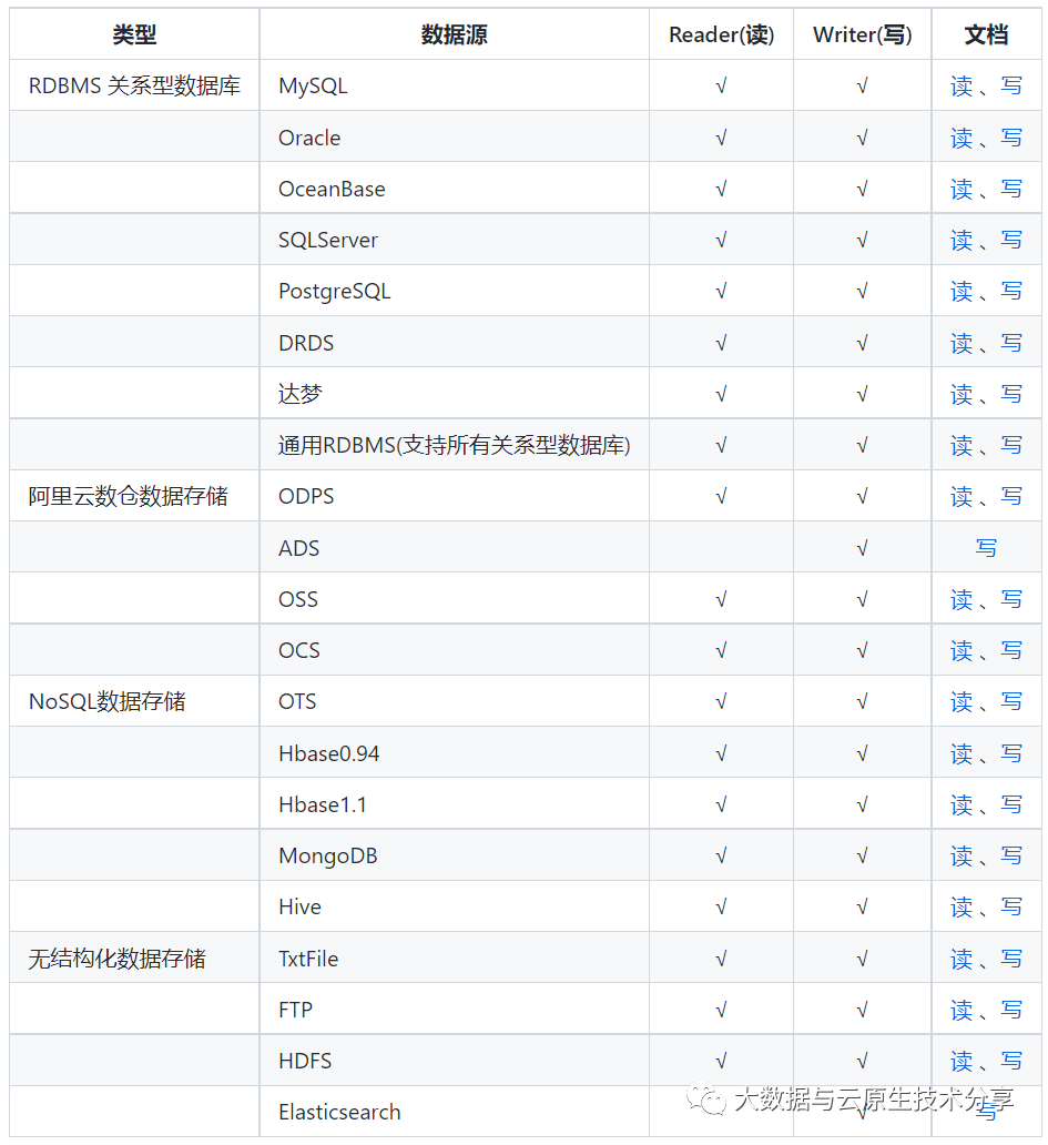 DataX目前已经有了比较全面的插件体系,主流的RDBMS数据库、NOSQL、大数据计算系统都已经接入。DataX目前支持数据如下图,详情请查看GitHub官方文档: